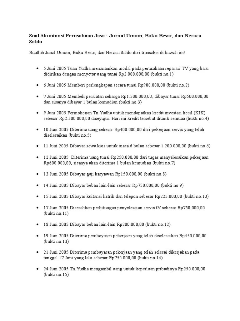 Contoh soal jurnal umum perusahaan jasa bengkel kumpulan soal pelajaran 6. Transaksi april 2014 atas usaha bengkel pak budi bernama bengkel maju. Berikut contoh soal cara membuat jurnal umum buku besar neraca saldo disesuaikan laporan laba rugi perubahan modal neraca keuangan dan laporan . Penelitian adalah perusahaan jasa yaitu bengkel dika motor di kabupaten agam. Arif mendirikan bengkel sepeda motor, .